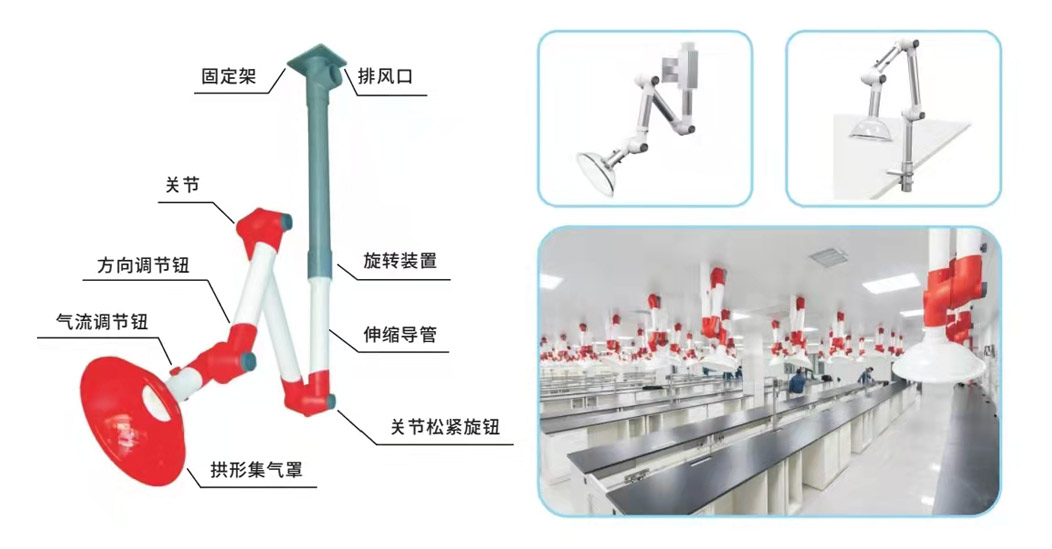 萬向抽氣罩是實(shí)驗(yàn)室排風(fēng)系統(tǒng)中的一部分,主要用來處理小的化學(xué)實(shí)驗(yàn)中產(chǎn)生的不良?xì)怏w,萬向抽氣罩主要是用來快速排放實(shí)驗(yàn)或生產(chǎn)過程中產(chǎn)生的小范圍的粉塵、熱氣、揮發(fā)性氣體、有害性氣體等小顆粒狀浮旋物或氣體的裝置。